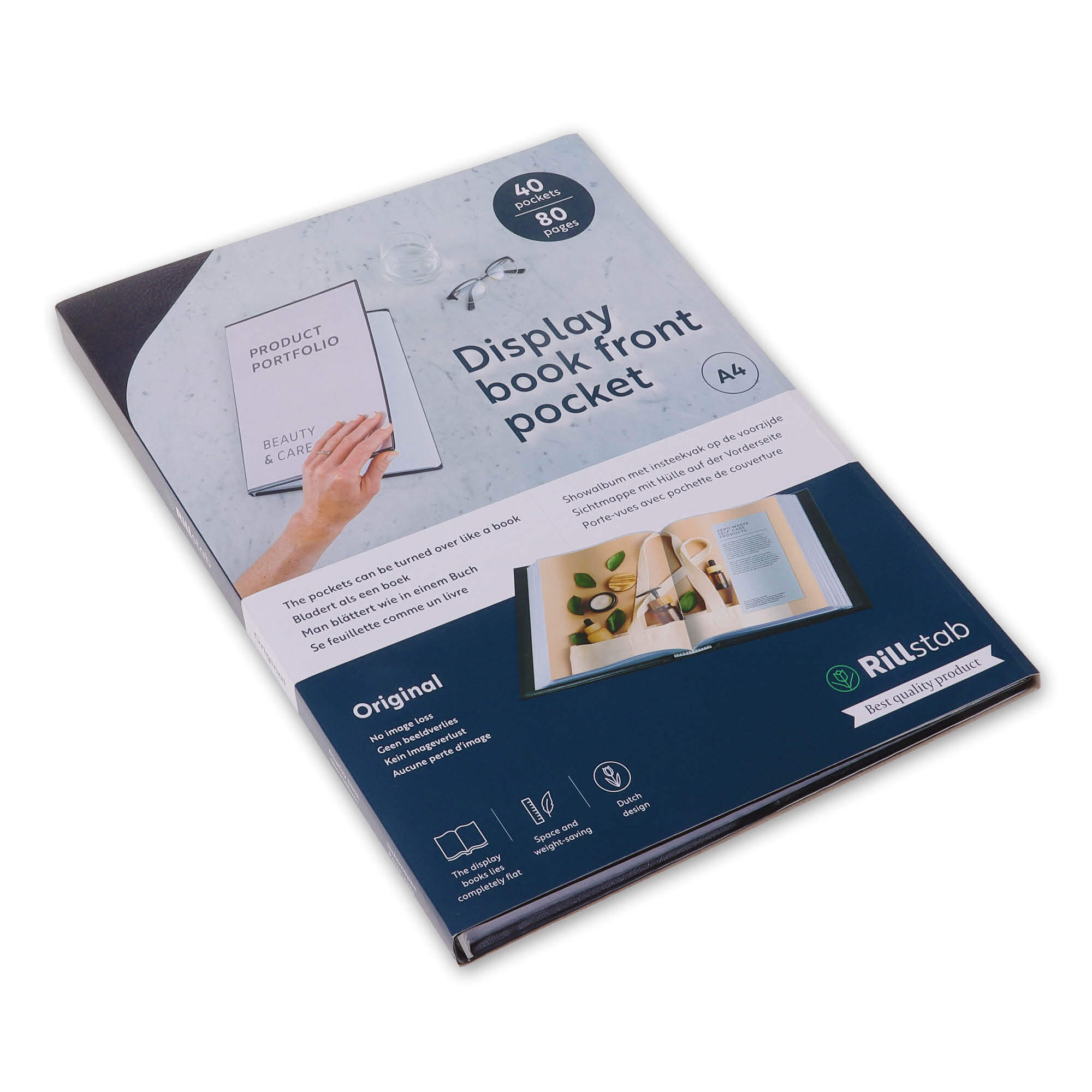 Deze A4 showmalbum is leverbaar met 40 tassen uit zuurvrij polypropyleen ( = 80 zichtzijden) in de kleur zwart. De voor- en achterzijde zijn voorzien van een transparant insteekvak waar een A4 document ingeschoven kan worden om het album te personaliseren. Hij is voorzien van het bekende Rillstab mechaniek. De tassen worden door middel van staafjes in een kanaal vastgehouden. Hierdoor kunt u bladeren als in een boek. En heeft u geen beeldverlies bij bijvoorbeeld A3 documenten. Het aantal kanalen is afhankelijk van het aantal tassen. Hierdoor variƫren de rugbreedtes.