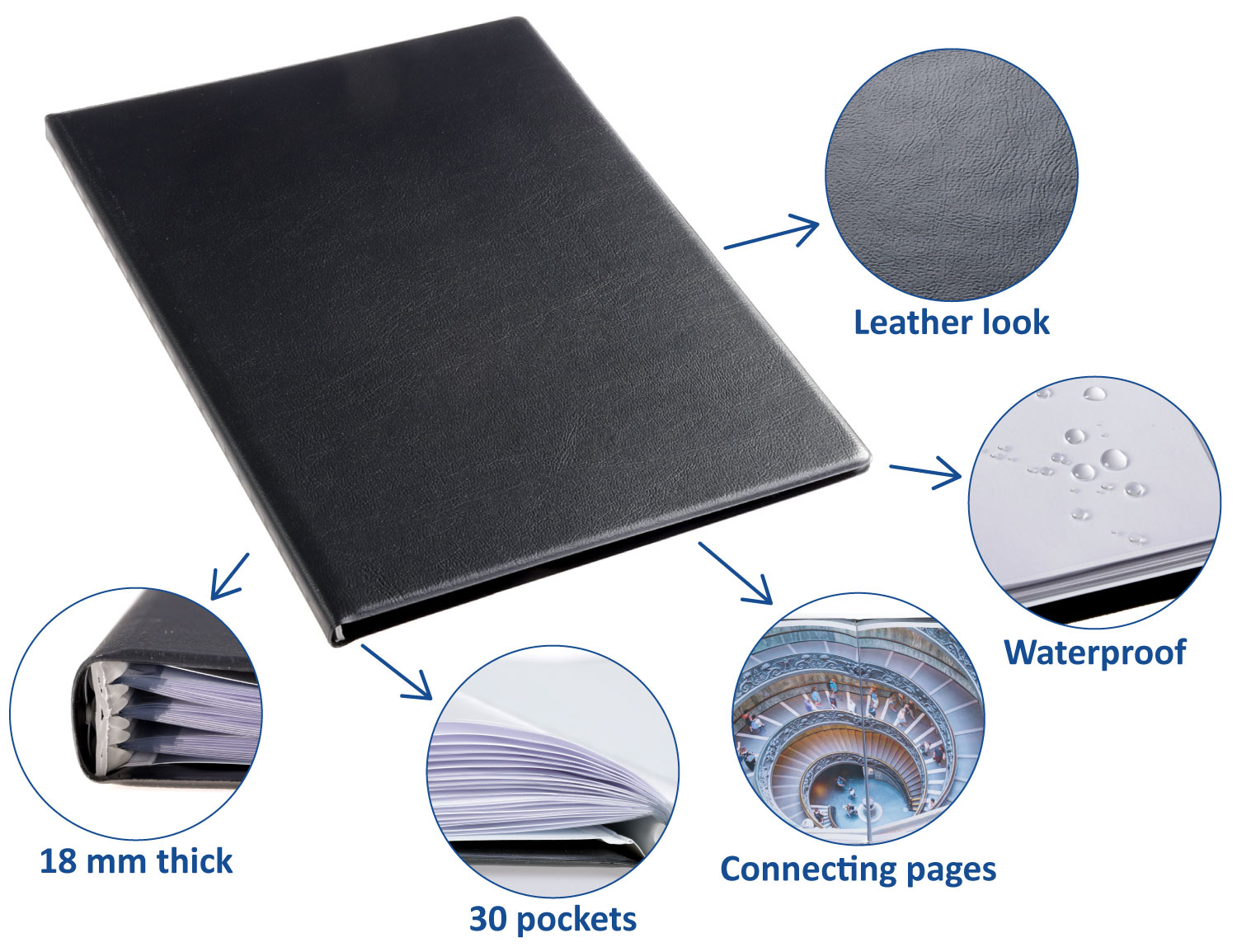 Rillstab showalbum A5 original vervaardigd uit generfd kunststof materiaal. In het midden het unieke Rillstab mechaniek voorzien van 30 binnentassen = 60 zichtzijdes A5 formaat uit zuurvrij polypropyleen. De binnentassen vervaardigd uit polypropyleen materiaal, glashelder, niet reflecterend, dikte 50 mu. Aan de rechter binnenzijde een verticaal insteekvak over de volledige hoogte. Kleur zwart. Ruimte- en gewichtbesparend ten opzichte van andere presentatiemappen en ringbanden. Bladeren als in een boek.